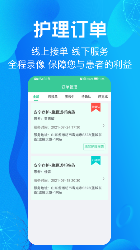 【护理服务】平台采用智能化派单系统,当患者线上下单后,系统会根据护理人员专业资质、服务范围、地理位置等因素自动匹配最优人选。接单后,护理人员可通过导航功能快速抵达服务地点,使用标准化服务流程为患者提供专业护理。每次服务完成后,系统会生成电子护理记录,便于后续跟踪管理。