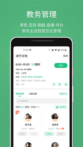 签到管理:一键式批量签到,即时短信通知签到,课程结束后老师及时下课。
