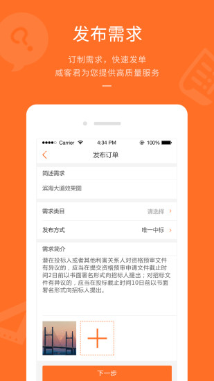 1.发布需求——用户可详细描述设计需求,包括预算、风格偏好等要素,系统将基于大数据分析智能推荐最匹配的服务商,确保项目快速启动。