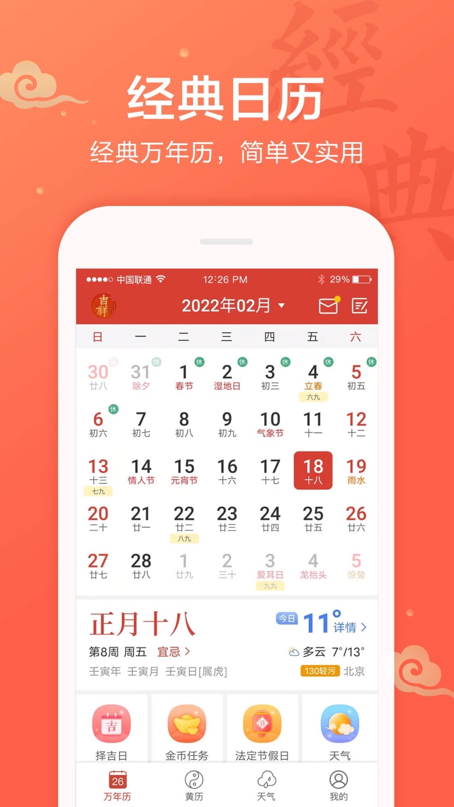 吉祥日历万年历app,一般又称吉祥日历app。吉祥日历是一款集万年历、农历、黄历、日常宜忌、节日节气信息查询,备忘记事、生活资讯于一体的工具应用,我们以"连接时间与有趣的事物"为宗旨,致力于成为用户时间维度上的连接纽带以及基于传统文化的信息交流平台。