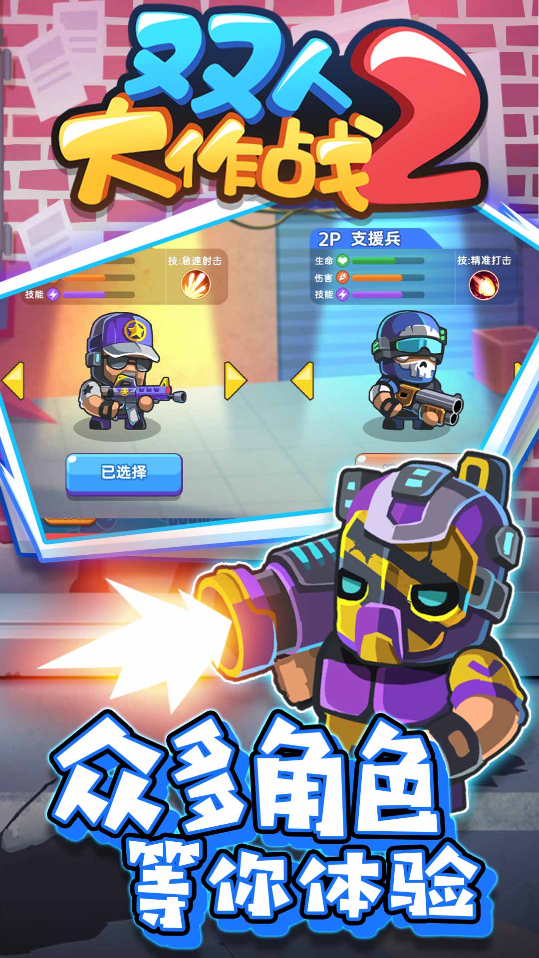 《双人大作战2》是一款充满激情的双人联机合作枪战手游,融合了联机对战、枪战射击、塔防策略等多种玩法元素。玩家可以邀请好友组队,在末日世界中并肩作战,解锁丰富武器,挑战全新僵尸模式。游戏提供多样化的战斗体验,从紧张刺激的枪战对决到考验策略的塔防玩法,更有单人模式满足不同玩家需求。流畅的操作手感和酷炫的视觉效果,让每场战斗都充满乐趣。