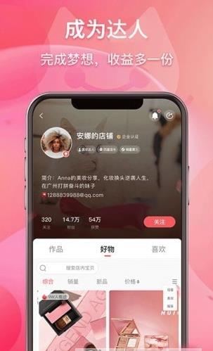 2、平台开创了个人创业新模式,用户只需简单申请就能成为平台达人。达人可以自由选择优质商品上架销售,通过社交分享带动店铺成交,实现零库存、低风险的创业梦想。