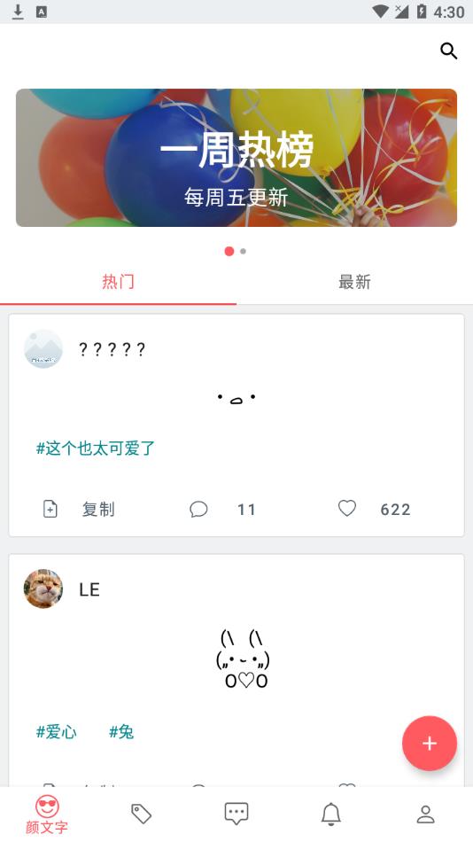 丰富的颜文字资源,还在持续增加中,可以收藏喜爱的颜文字;平台每天都会新增数百个创意表情,满足不同场景的使用需求。自定义颜文字,选择真的超级丰富,点击就能复制颜文字;用户可以根据个人喜好调整表情细节,打造专属个性风格。特色榜单:一周热门、用户创建榜,一系列的主题,你可以改变。这些榜单不仅展示最受欢迎的表情,还能激发用户的创作灵感,让每个人都成为表情艺术家。