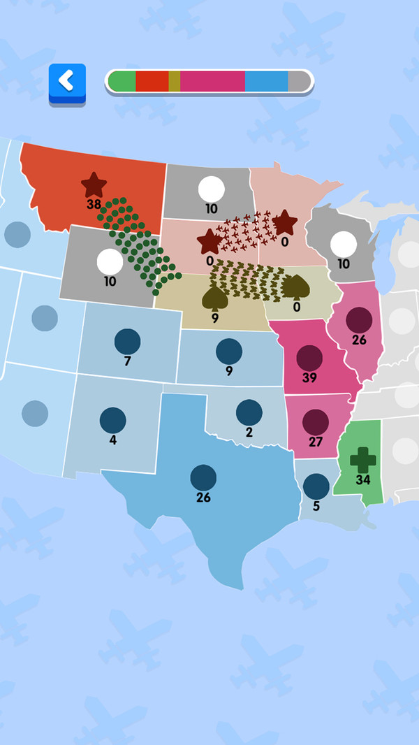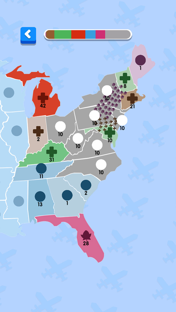 玩家只需点击已有兵力的区域,再滑动到目标地区即可派遣兵力进攻。游戏以真实世界地图为背景,初始关卡的设计让玩家仿佛置身于真实的南北征战之中。随着时间推移,占领的地区会持续产出兵力,为扩张提供源源不断的支持。想要通关,玩家需要占领关卡内的所有地区,才能开启新的征程。此外,合理利用地形优势和兵力分配是取胜的关键,建议优先占领资源丰富的区域,以加快兵力增长速度。