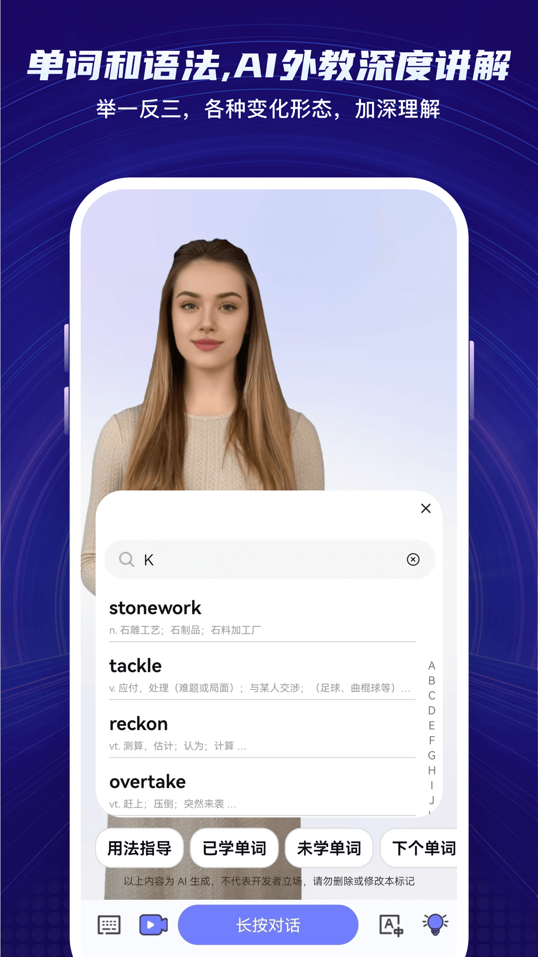 1.全面的英语知识内容库持续更新,不仅支持模拟真人外教对话,还提供语法解析、词汇拓展等系统化学习资源。