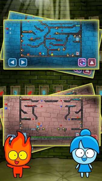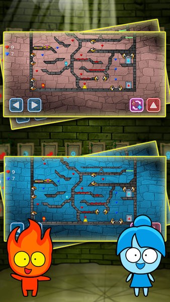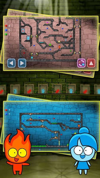 3.角色拥有成长系统,可通过收集资源强化能力。升级后的火人能短暂防水,冰人则可制造更持久的冰面,但需要合理分配强化点数。