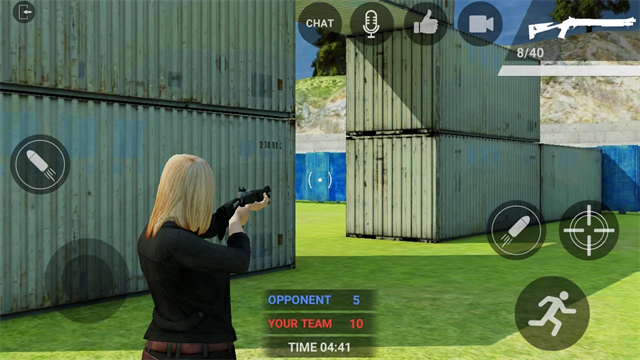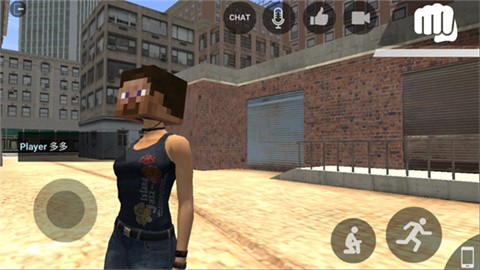 2、进入游戏后,通过点击"chat"可以与NPC进行互动对话,左侧虚拟摇杆控制角色前后移动,右侧按钮则负责蹲下和跳跃等动作。