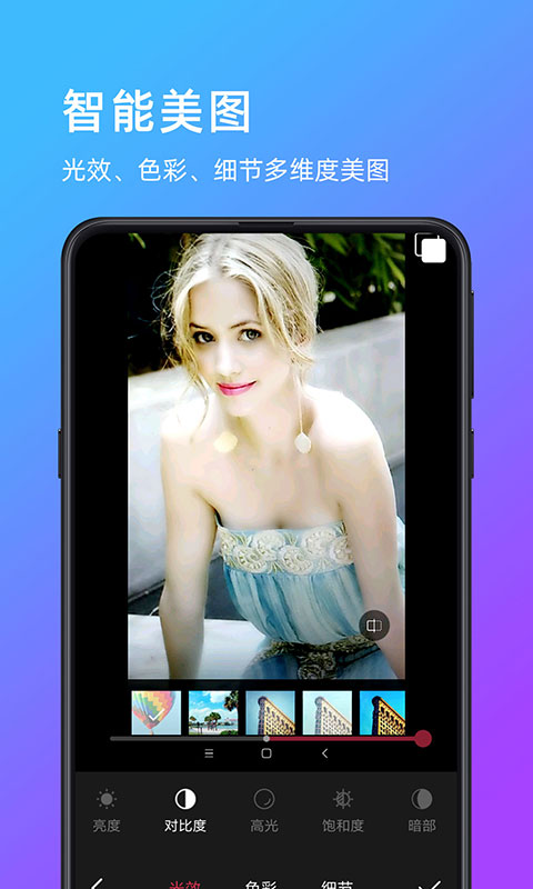 支持一键美图功能,提供光效、滤镜、色彩等多维度调整选项。无论是调整亮度对比度,还是添加艺术效果,都能轻松实现专业级的修图效果。
