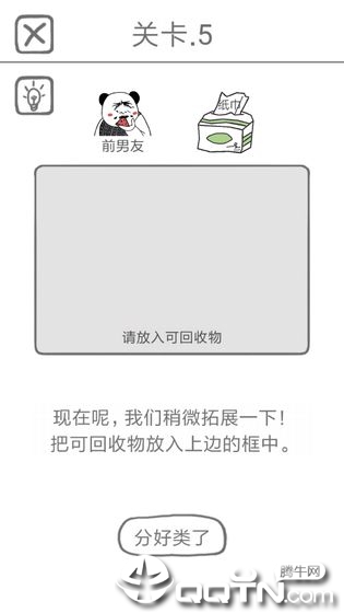 《前男友是什么垃圾》是一款以垃圾分类为主题的魔性休闲闯关游戏,通过幽默诙谐的方式让玩家在娱乐中学习垃圾分类知识。游戏将"前男友"作为分类对象,用灵魂拷问的方式引发玩家思考,既有趣又富有教育意义。精心设计的数十个关卡带来层层递进的挑战,简洁清爽的界面和轻松愉快的背景音乐让游戏体验更加舒适。无论是想学习垃圾分类,还是单纯寻找解压方式,这款游戏都能满足你的需求。