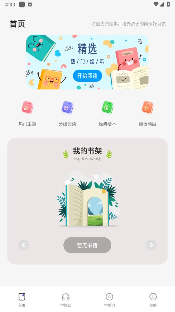 本App汇聚全球顶尖教育机构推荐的优质绘本资源,包含数百本原版英文绘本和经典中文图书。特别采用分级阅读系统,根据儿童不同年龄段的认知特点科学编排内容,从启蒙阶段的自然拼读到进阶阶段的整句跟读循序渐进。生动有趣的插画配合专业配音,打造视听结合的双语学习环境,让孩子在享受故事乐趣的同时,潜移默化地培养英语语感和中文阅读能力。