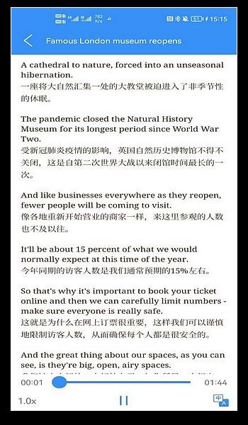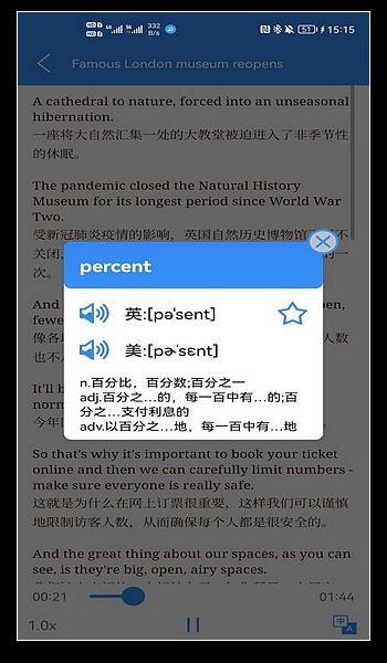 独家研发的语音高亮跟随技术,能让文本内容随着音频播放实时高亮显示。这项功能特别适合跟读训练,帮助用户准确把握每个单词的发音节奏。支持0.5-2.0倍速调节,满足不同水平学习者的需求。