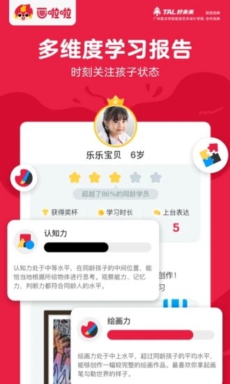 画啦啦美术课堂是一款专为3-12岁儿童设计的创意美术学习平台,通过趣味互动的方式激发孩子的艺术潜能。软件采用个性化教学模式,由专业美术教师全程指导,结合多元化的课程内容,帮助孩子在绘画中培养审美能力、创造力和专注力。平台运用AI智能评估系统,实时跟踪学习进度,为孩子定制专属成长路径。家长可以通过成长报告直观了解孩子的进步,见证孩子在色彩感知、构图思维等方面的全面提升。
