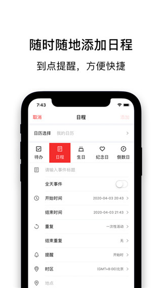 2、在这里,我们可以根据自己的需求来选择新建日程、生日、纪念日、倒数日。多种提醒类型满足不同场景需求,操作简单直观。