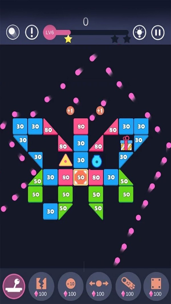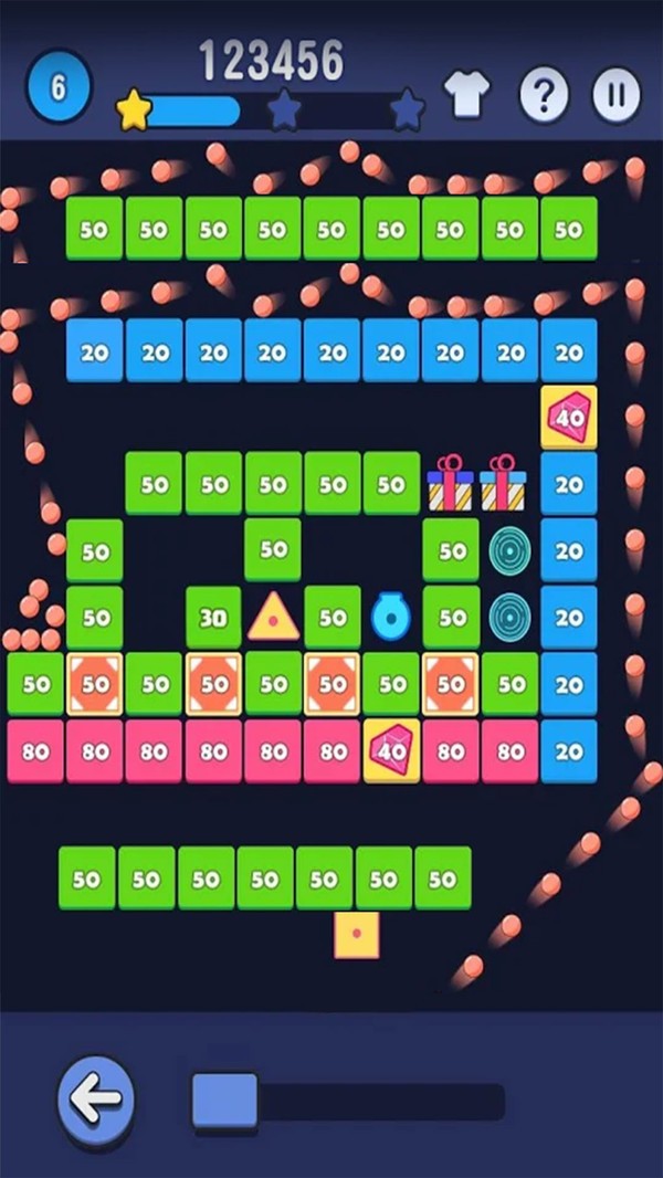 本作采用直观的触控操作体系,单指滑动即可360度控制反弹板角度。弹球在撞击过程中会遵循真实的物理轨迹,玩家需计算反射角度来达成连锁破坏。砖块上的数字代表剩余击打次数,当数字归零时会触发粒子爆破特效。特别设计的"暴击系统"让连续命中同色砖块产生额外伤害,而掉落的道具包含激光穿透、多重弹球等十余种强化效果。每关还隐藏着金色砖块,击碎后可解锁特殊挑战关卡,为闯关过程增添策略深度。