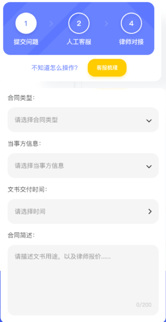 2、用户可以根据自己的问题需求来进行选择,平台创新性地设置了法律需求评估问卷,如果在律师选择方面遇到了困难,可以咨询平台中的法律管家来帮忙完成匹配,确保找到最适合的解决方案;