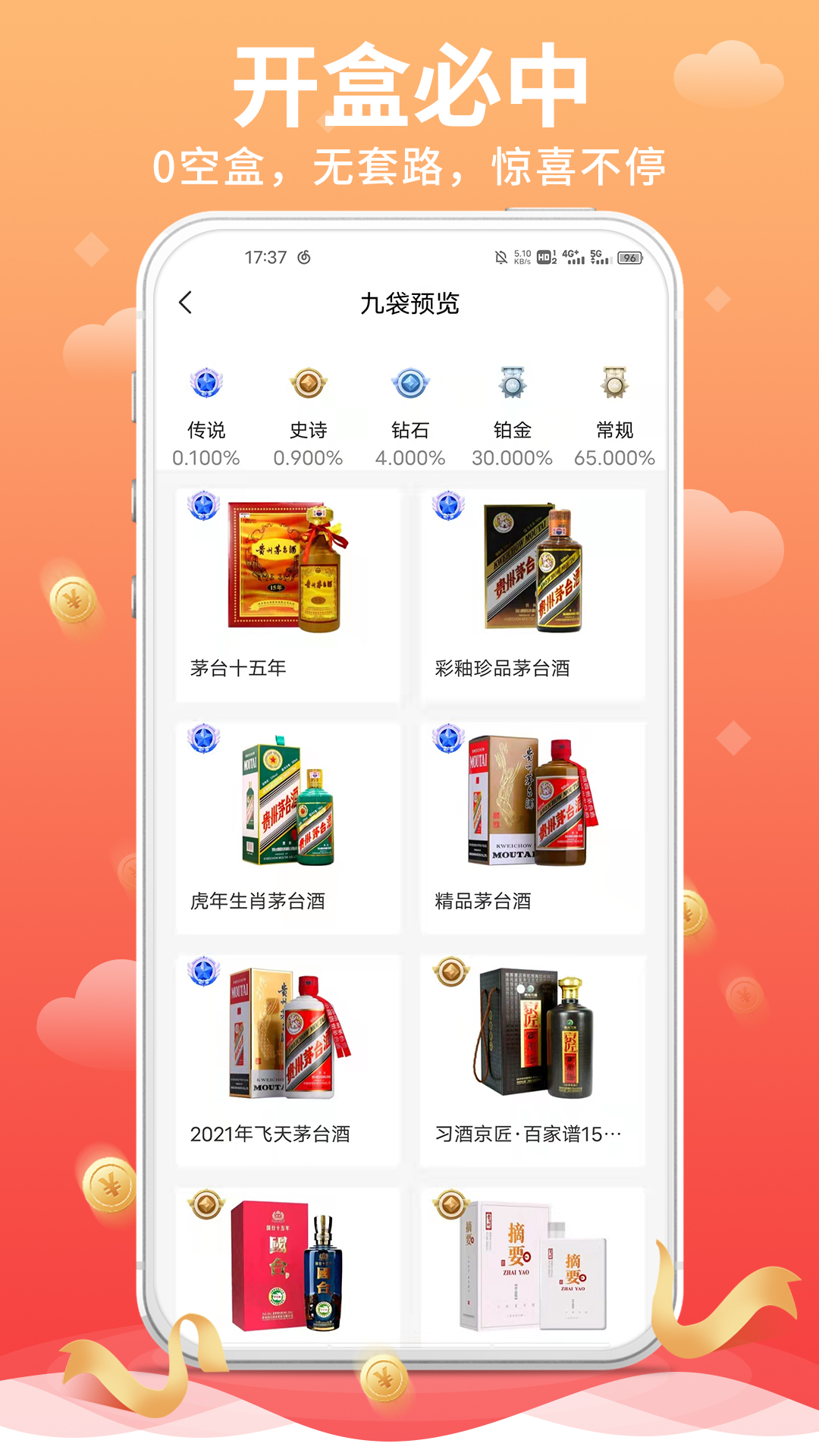 【惊喜九盒】精心挑选优质好酒,更有机会开出茅台酒,让盒子不再是年轻人的游戏。平台定期更新酒品库,引入更多稀缺名酒,提升用户的获奖体验。每款酒品都附带详细介绍,帮助用户了解其产地、年份和风味特点。