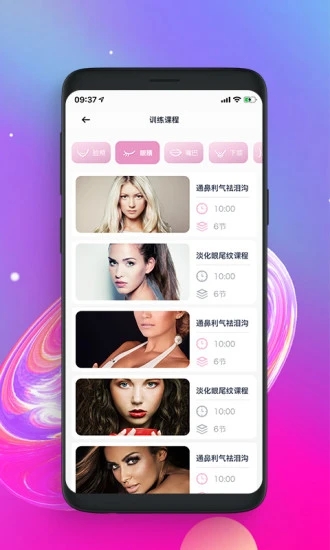 2、智能分类系统让用户能精准找到所需训练,无论是想改善特定部位(如眼周、嘴角),还是追求整体提升(V脸塑造、苹果肌饱满),都能快速匹配对应课程;