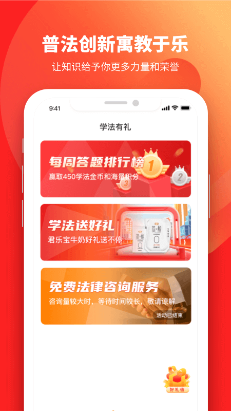 积分闯关:创新性地将法律学习与游戏机制相结合,用户可以通过答题复习巩固所学知识。系统会根据答题正确率给予相应积分,累积积分可参与每周王者榜排名。表现优异者将获得"学习好公民"称号及相应奖励,激发学习积极性。