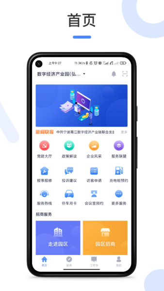 首页:精心设计的首页界面,实时推送园区最新资讯、活动公告和重要通知,同时提供常用功能的快捷入口,让用户第一时间获取关键信息。