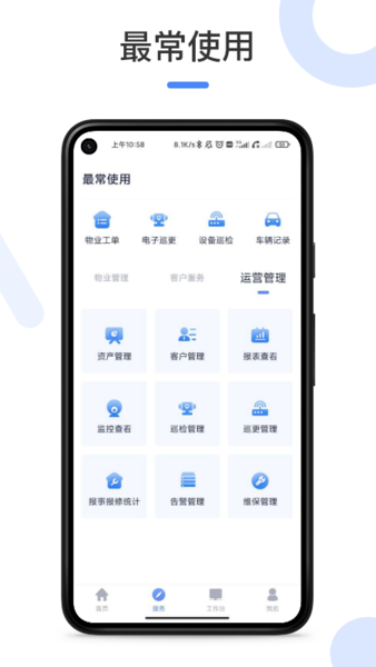 工作台:专为物业人员设计的专业工作平台,支持工单处理、设备巡检、巡更管理等核心业务,实现任务的高效流转和实时追踪。