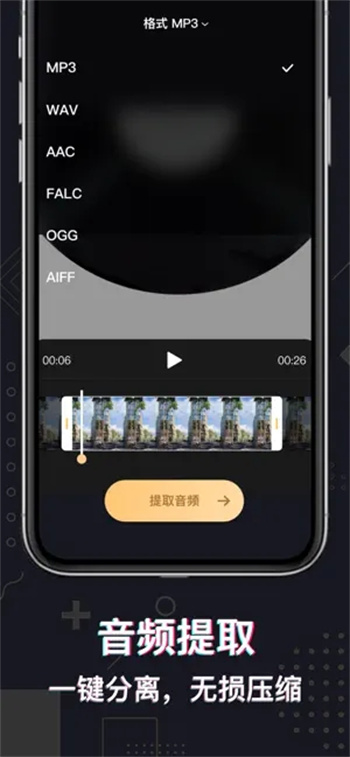 5.专门提供了音频提取的功能,点击相应的按钮,就可以一键将视频音频进行分离,可以达到无损音质的压缩效果。支持从视频中提取背景音乐或人声,还能对音频进行降噪、变声等处理。输出格式包括MP3、WAV等常见音频格式,满足不同场景的使用需求。