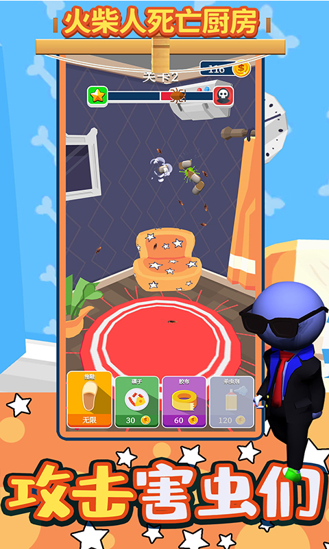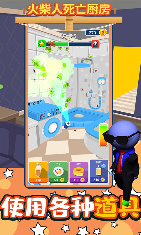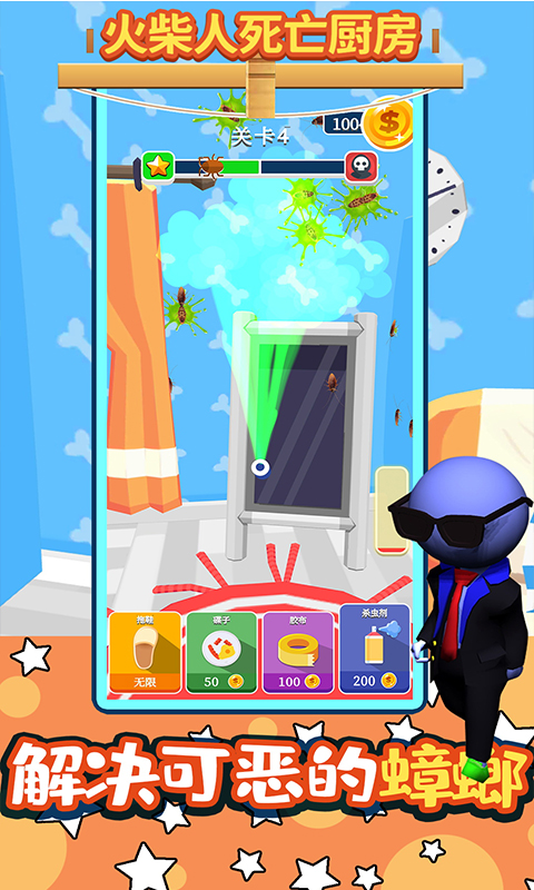 《火柴人死亡厨房》是一款以消灭蟑螂为主题的休闲解压游戏。在游戏中,玩家将化身为厨房斗士,使用水枪、火焰喷射器、炸药包等丰富武器对抗四处逃窜的蟑螂大军。逼真的物理效果搭配爽快的打击感,让每次击杀都充满乐趣。游戏采用轻松简单的操作方式,适合各类玩家在碎片时间体验,既能享受消灭害虫的快感,又能有效释放日常压力。