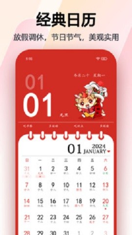 1、日历:精美的日期展示,完整的节日日历,周历、月历、年历随意查看,节假日、休息日清晰备注,同时还有国际节日,传统节日,佛教节日,二十四节气等;