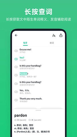 3、便捷的长按查词功能,只需长按文中陌生单词即可立即获取释义和标准发音,让阅读学习更加流畅高效。