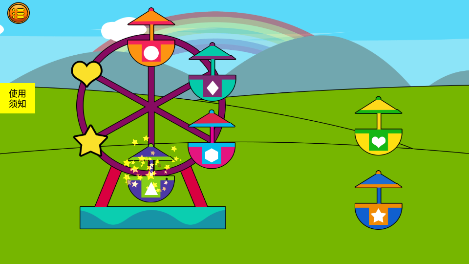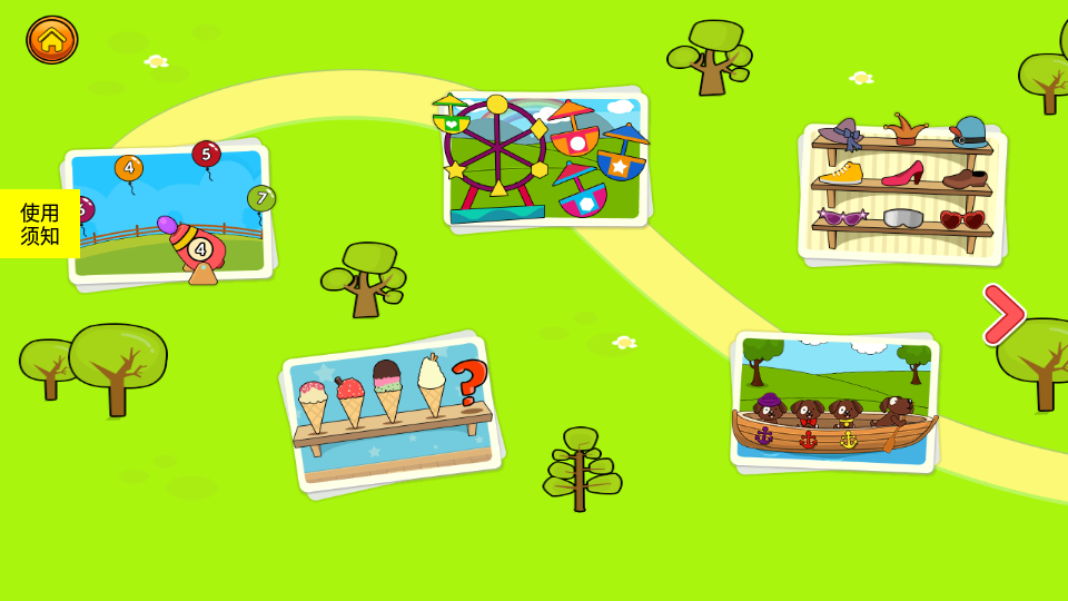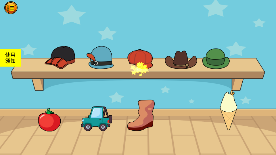 1、收获难题:在农场场景中识别不同种类的水果蔬菜,学习分类和归纳。2、数字气球射击:通过射击标有数字的气球,帮助孩子建立数量概念和基础运算能力。3、潜水艇匹配:在海底世界寻找颜色形状相符的海洋生物,培养观察力。4、大小排序:将不同尺寸的动物或物品按顺序排列,理解大小关系。5、幼犬回家:根据颜色线索为小狗规划回家路线,训练颜色辨识能力。6、查找匹配对象:在杂乱的场景中快速找出同类物品,提升专注力。7、旋转木马:通过拼装木马缺失部件了解几何形状特征。8、隐藏对象:在复杂画面中发现隐蔽物品,锻炼细节观察能力。9、对象排序:将散落的玩具分类收纳,培养整理习惯。10、帐篷修补:根据帐篷缺口形状寻找对应补丁,强化形状认知。