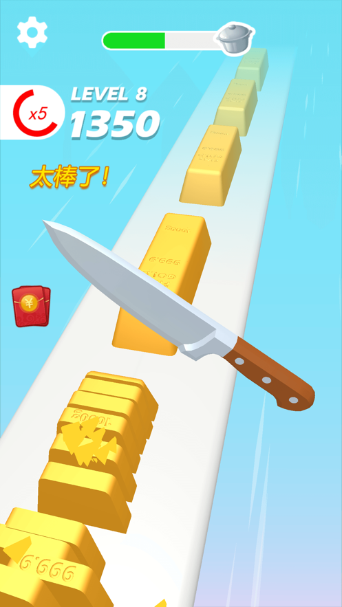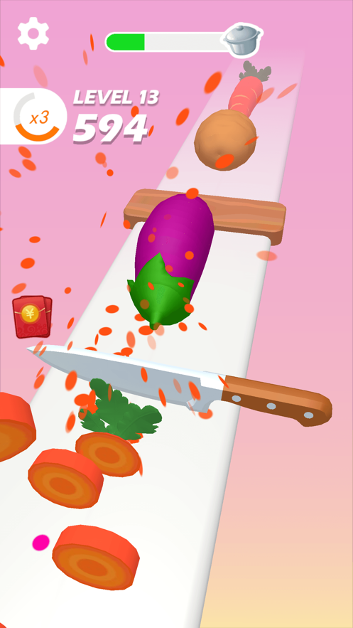 2、游戏内置完善的装备系统,玩家可以通过赚取金币购买更高级的菜刀。这些高级菜刀不仅外观炫酷,还能提升切割效率,让玩家在挑战中获得更大优势;