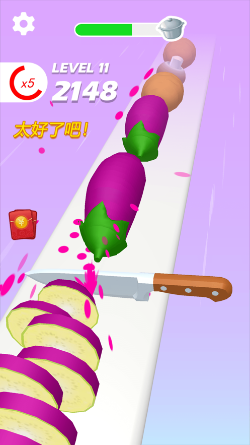 3、游戏采用关卡制设计,每个关卡都有特定的切菜目标,完成目标即可获得红包奖励。随着游戏深入,关卡难度会逐渐提升,但奖励也会更加丰厚,让玩家在享受游戏乐趣的同时还能获得实际收益;