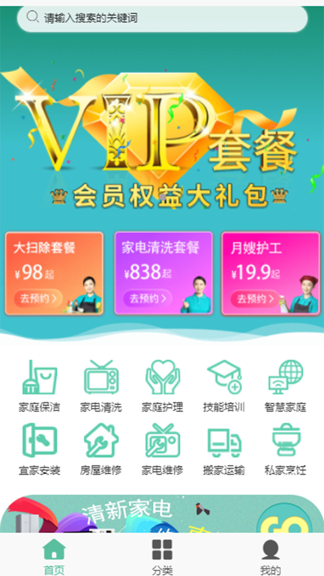 1、一站式家政服务平台,家电维修、清洁或是月嫂等服务都是支持的。平台整合了家居生活的全场景服务,包括家电维修、管道疏通、深度保洁、育儿护理等12大类服务。独创的"服务套餐"功能,可根据房屋面积、服务时长等参数智能生成最优方案。