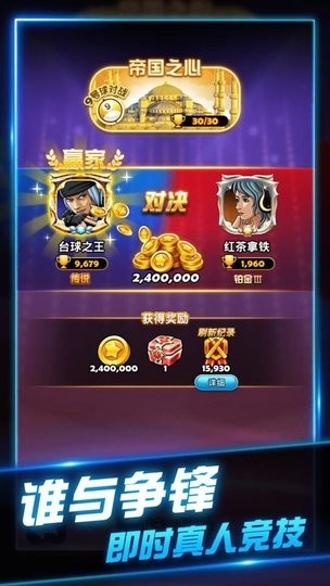 4、完善的荣誉体系记录玩家成长轨迹,全球排行榜实时更新。通过参加官方认证赛事可获得专属称号和稀有奖励,成就台球传奇。