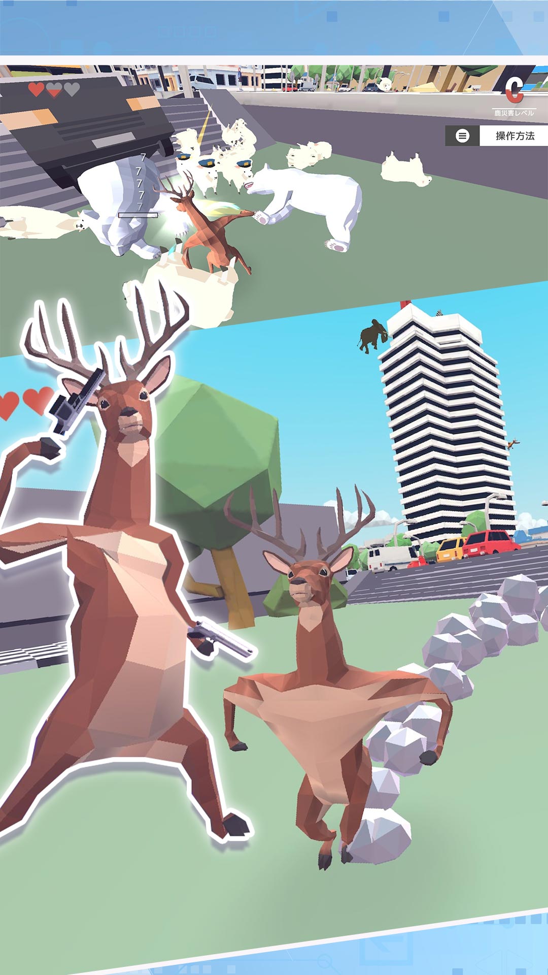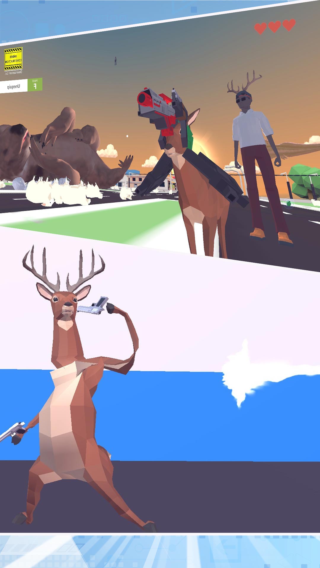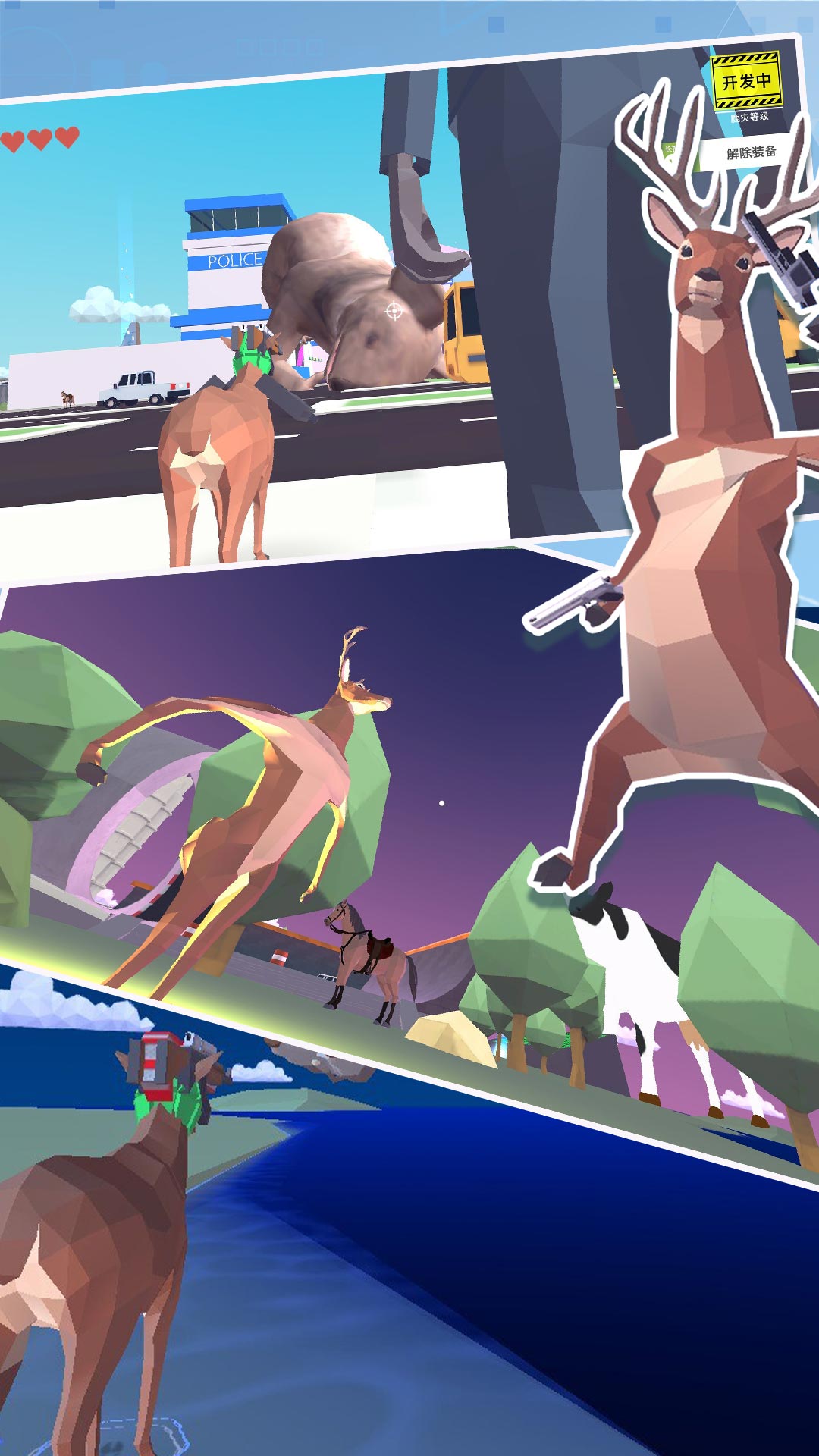 游戏采用非线性任务结构,完成送外卖、破坏监控等日常任务可获得金币升级装备。特殊挑战如"十分钟内引发三级警报"会解锁限定皮肤和表情包。角色成长系统包含12种变异方向,比如选择强化鹿角可以刺穿装甲车,强化后腿则能跳上摩天楼。昼夜交替系统让城市呈现不同面貌,夜间会出现神秘的鹿神教集会。联机模式支持4人合作,玩家可以组队对抗加强版机械警察,或是举办最搞笑的变形比赛。定期更新的节日活动还会加入圣诞鹿车、南瓜头等限定内容。