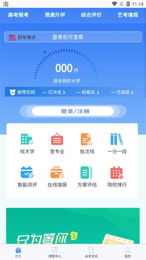 1、运行百年育才app后,用户需先完成注册并登录。登录成功后,首页将展示AI高考志愿填报、AI高考提分以及高考工具箱三大核心功能模块。高考工具箱内包含找大学、查专业、测概率、分数线查询等实用工具,帮助考生快速获取关键信息。