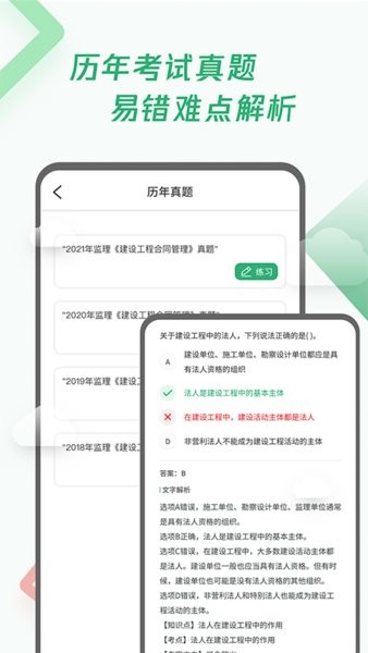 完整收录近10年建造师考试真题,每道题目都配有详细解析和考点分析。通过真题模拟考试功能,考生可以真实体验考场氛围,了解命题规律,同时系统会自动记录错题,生成易错点报告,帮助考生针对性强化薄弱环节。
