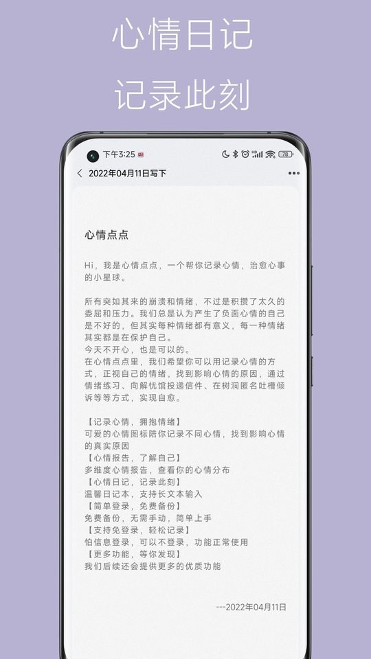 3、【心情报告,了解自己】基于大数据分析生成周/月/季三维报告,包含情绪波动曲线、高频关键词云图和改善建议。支持生成可分享的年度情绪纪念册。