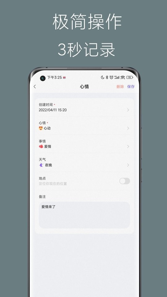 1、革命性的"三秒记录"技术,通过语音转文字和智能预测输入,实现真正的极简操作。新增摇一摇快速记录手势,紧急情绪随时捕捉。