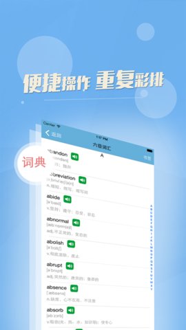 四六级英语书架是一个方便易用的移动英语学习服平台。用户可以通过该软件直接学习手机英语,收集了大量高质量的英语单词,并且有各种各样的关键词都有,帮助用户解决学习难度。