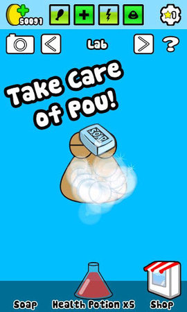 当小土豆在吃东西或玩耍时,它有时会变脏。此时,你可以去浴室,将肥皂拖到小土豆上,然后单击屏幕左下角的淋浴按钮,将其拖到小土豆上清洗肥皂泡沫。太脏会影响小土豆的健康,并间接影响小土豆的生长。