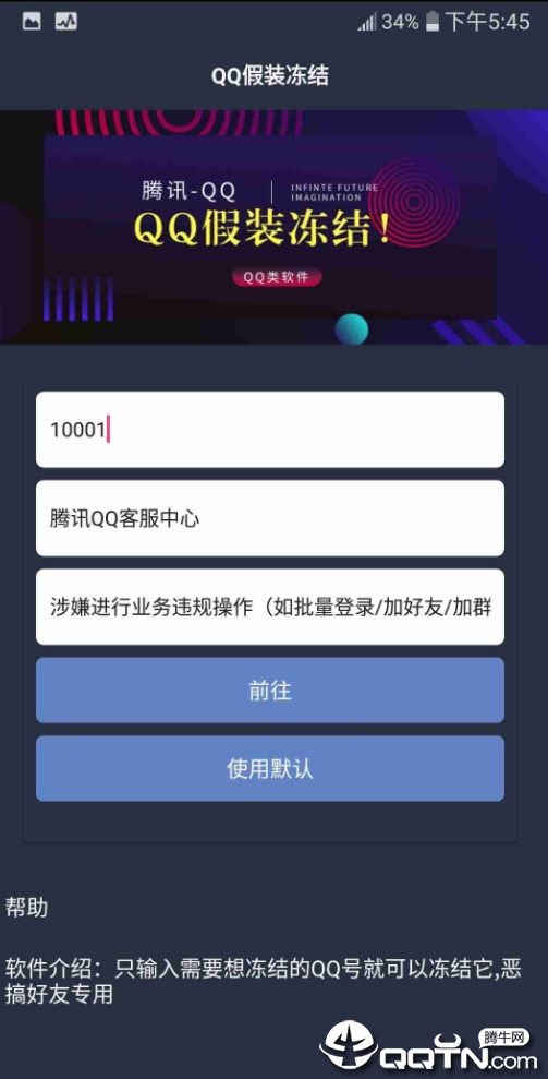 2.进入主界面后,在指定位置输入想要恶搞的QQ号码,然后选择或自定义冻结原因,设置冻结时长。软件提供多种预设选项,也可以完全自由发挥创意。