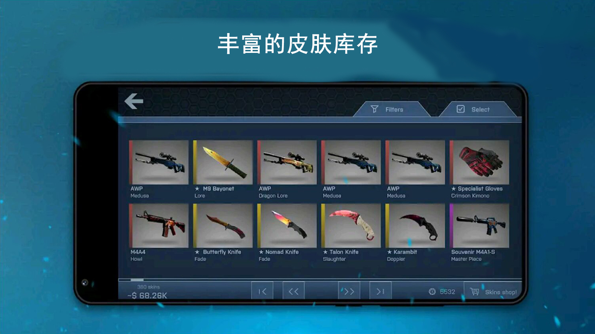 2、开箱-在这里您可以找到各种皮肤箱:金色传说、红色、紫色、等等。每种箱子都有独特的掉落概率和稀有皮肤,开箱时的特效和音效也极具沉浸感。