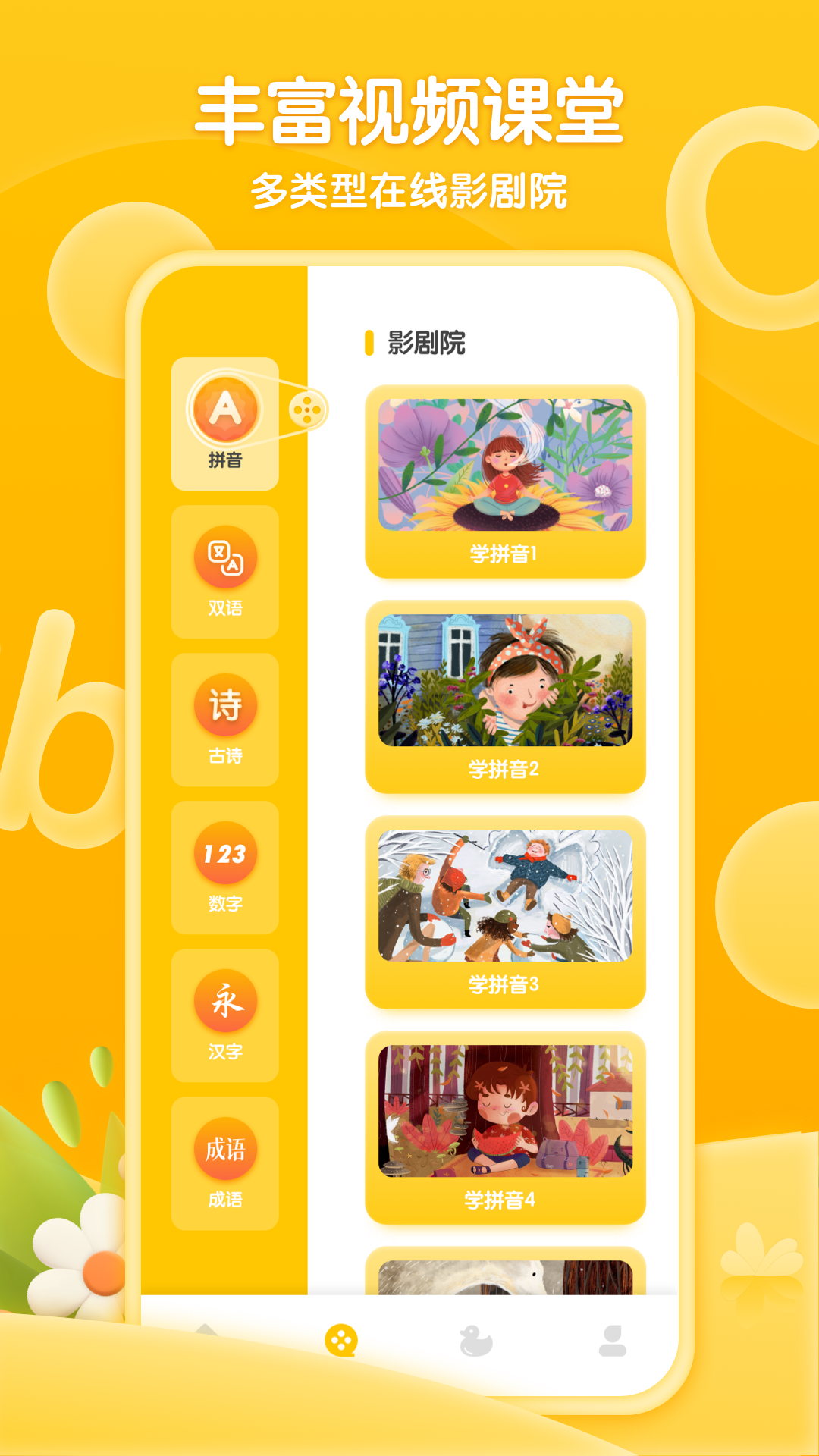 【影剧院】精心制作的拼音儿歌剧场,包含上百首朗朗上口的儿歌,配合生动动画,让孩子在音乐中自然记忆拼音。每首儿歌都配有互动环节,增强参与感。