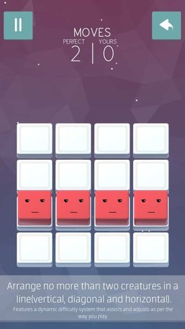 《排排站好 Phase Spur》是一款休闲类游戏。这里有一群可爱的小动物,当他们是快乐的时候他们的精神和可爱被玩家们所爱。然而当他们感到不安时,他们就会非常恼人。所以只有一件事可以让他们快乐,那就是在游戏中一条线上最多有两个生物包括水平和垂直或对角线。