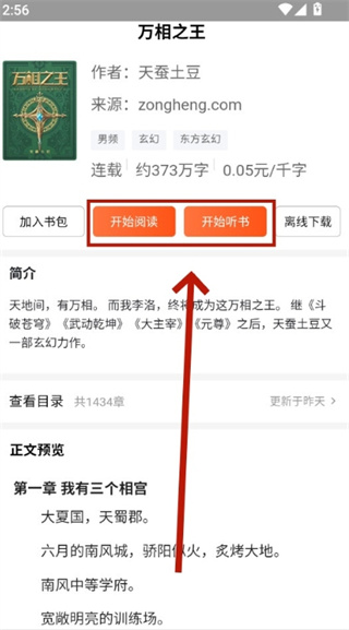 3、打开详情页后可以根据需求选择在线阅读、听有声书或下载到本地。如果网络条件允许,建议先试读几章了解写作风格,再决定是否继续阅读或下载。