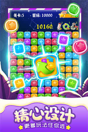 3、经典玩法:在传统三消规则基础上,创新加入"星座连锁"机制——当连续消除形成特定图案时可触发额外奖励。关卡设计融入解谜元素,部分关卡需要玩家先消除屏障星才能触及目标星星,这种层层推进的设定大大增强了游戏的可玩性。