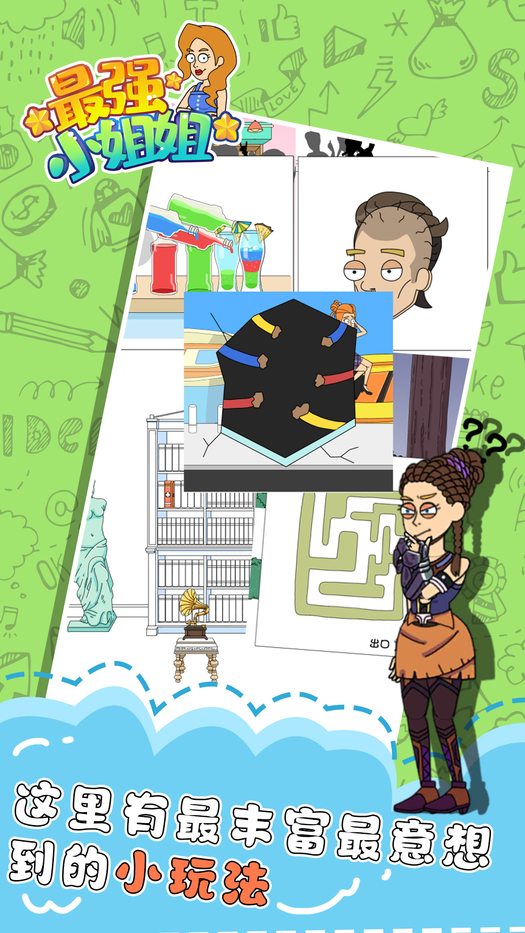 《最强小姐姐》是一款充满创意与欢乐的休闲解谜游戏,玩家将化身"脑洞大师",帮助小姐姐突破重重难关。游戏设计了上百个奇思妙想的关卡,每个关卡都考验玩家的逆向思维能力。清新可爱的画风搭配爆笑剧情,让解谜过程充满乐趣。无论是奇葩的密室设计,还是出人意料的线索摆放,都需要玩家大开脑洞才能破解。无需联网即可畅玩,随时随地都能享受烧脑又解压的游戏体验。