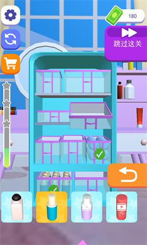 2.关卡的难度会随着玩家的挑战不断的增加,玩家需要发挥自己的眼里,找到所有的化妆品将它们归纳好。高级关卡中会出现需要解谜的元素,比如需要先整理好化妆刷才能打开隐藏抽屉,或者要按照色系顺序摆放才能解锁收纳空间。