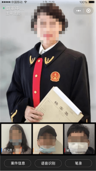 法官点击开庭后,语音、画面、笔录实时同步显示。庭审期间,原被告可以进行举证、质证、辩论等。