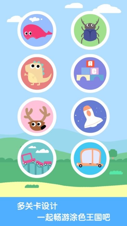 3、24张底图随意涂色绘画,包含动物、植物、交通工具等儿童喜爱的主题。每张底图都经过专业美术设计,既美观又富有教育意义。
